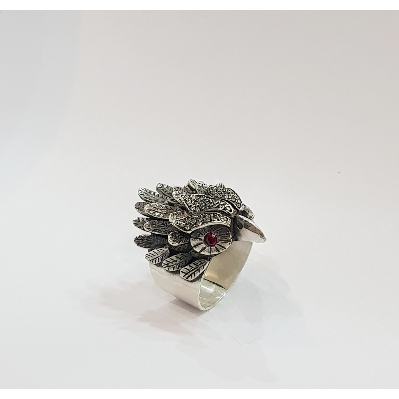 جنس این محصول که طراحی منحصر به فردی دارد، نقره 925 بوده و کاملا دست ساز است. برای ساخت این انگشتر از دو هنر مخراج و قلم زنی کمک گرفته شده است.